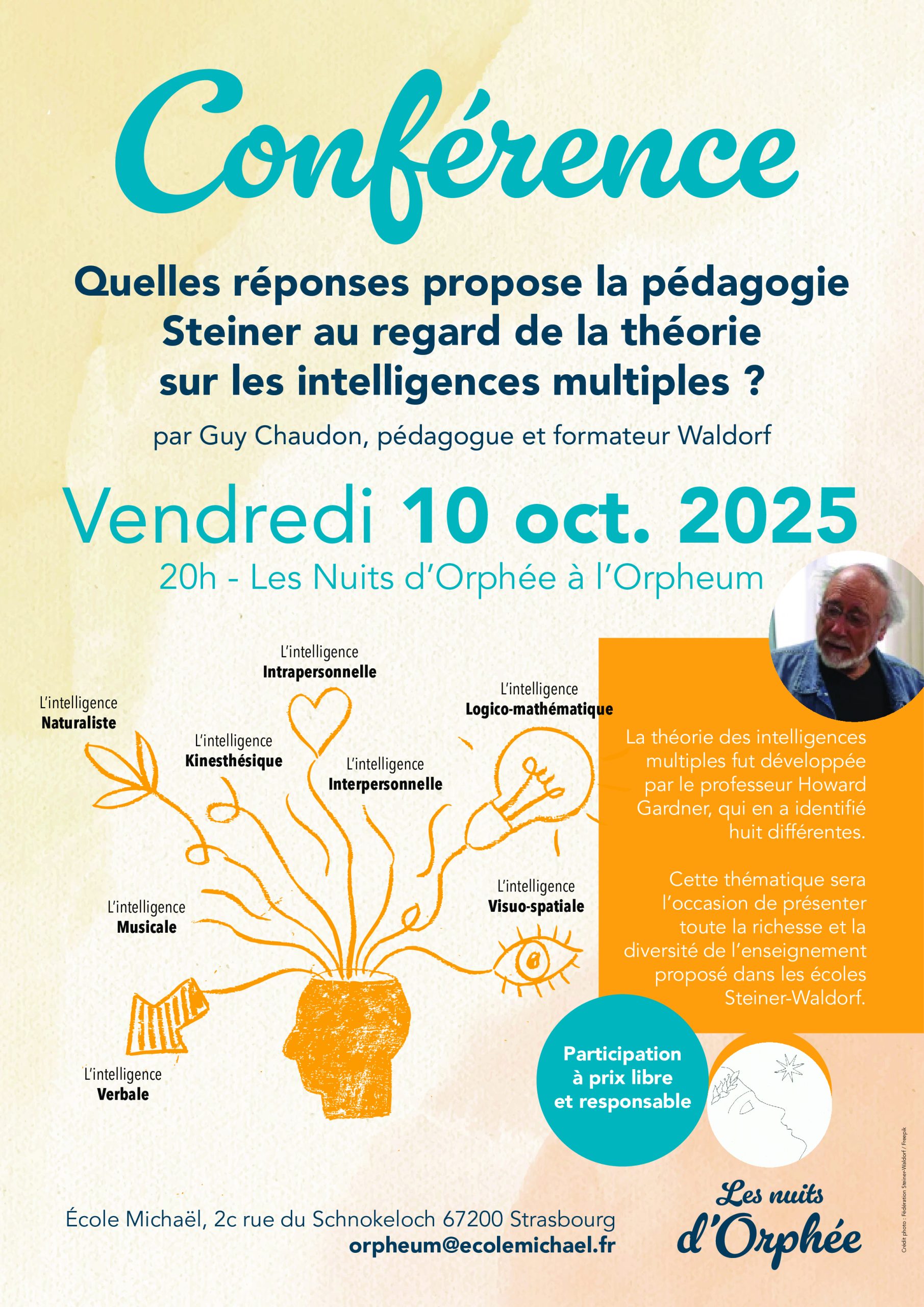 Quelles réponses propose la pédagogie Steiner au regard de la théorie sur les intelligences multiples? Vendredi 10 octobre à 20h Par Guy Chaudon, pédagogue et formateur Waldorf. Venez nombreux assister