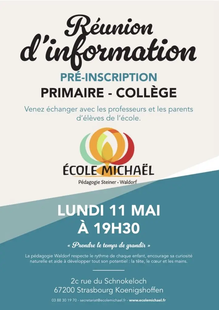 La soirée du lundi 11 mai est pour vous ! Rendez-vous à 19h30 au 2C Rue du Schnokeloch, afin de participer à un échange constructif autour de la pédagogie Steiner Waldorf pour les élèves de primaire et de collège.